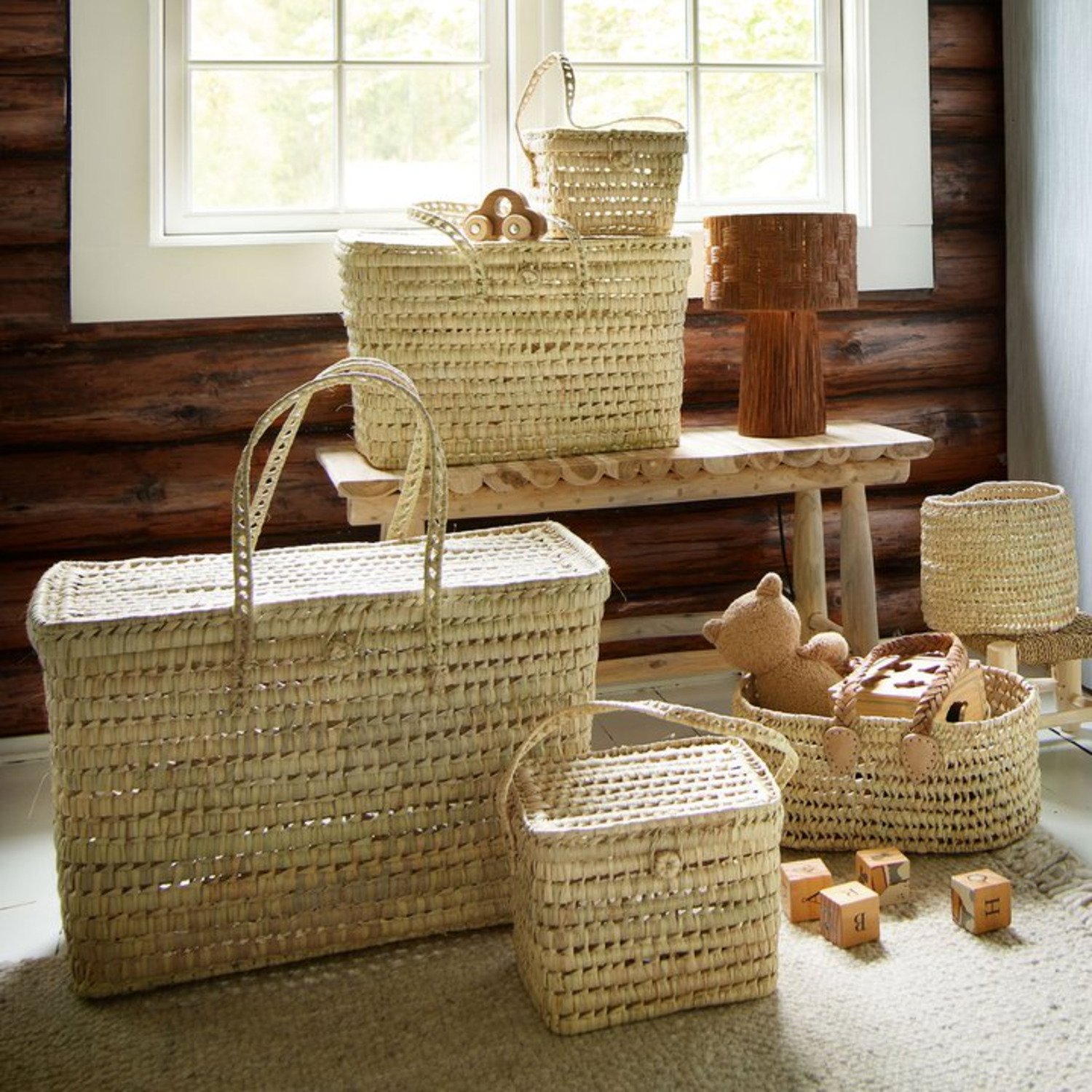 Een set van twee grote, handgeweven manden met deksel en handgrepen. Ideaal voor het opbergen van speelgoed in de kinderkamer of om alledaagse spullen georganiseerd te houden in de hal. Dankzij de handgrepen zijn de manden eenvoudig mee te nemen door het huis of naar de tuin wanneer het spelen zich naar buiten verplaatst.