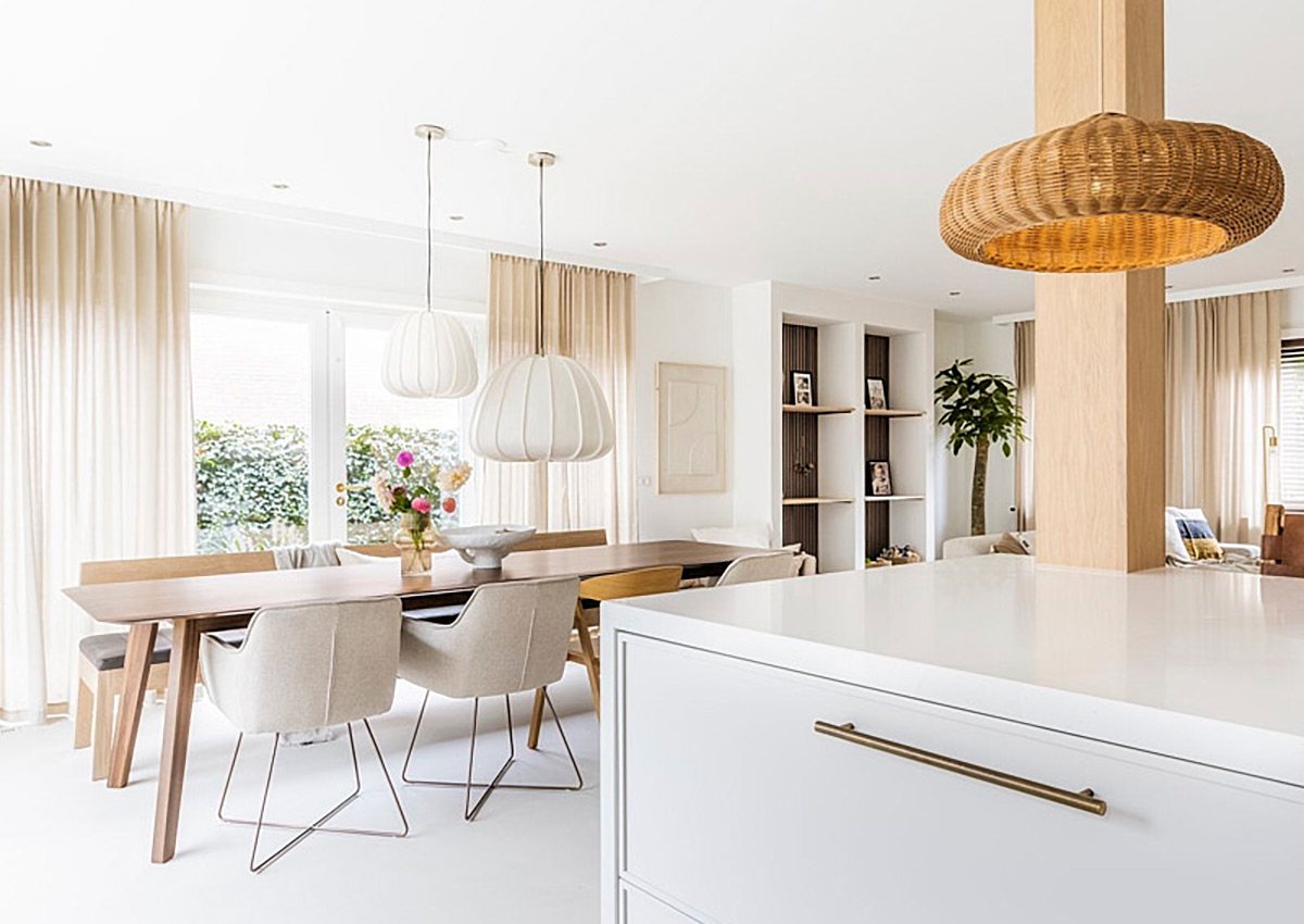 De woonkeuken en uitnodigende living zijn het centrale punt in deze woning. Naast de diverse woonaccessoires verspreid in het huis, hebben wij deze prachtige eetkamer gestyled. Onder andere met een gezeept eiken eetkamerbank. Een eenvoudig vormgegeven item, maar uniek en stoer door de combinatie met het donkere leer. Grote lichte lampen vergroten het ruimtelijke effect van deze eetkamer