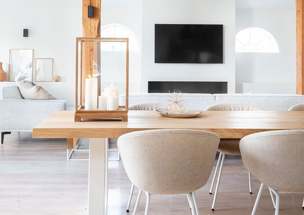 Met een basis van lichte kleuren biedt deze gemoderniseerde boerderij het perfecte decor voor natuurlijke en warme materialen.
